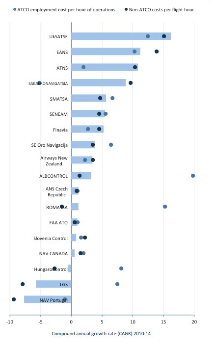In terms of overall cost efficiency – measured as average cost per flight hour – only three ANSPs improved their cost efficiency between 2010 and 2014 (NAV Portugal, the Latvian ANSP LGS, and Hungarocontrol). At the other end of the scale, seven ANSPs had increases in their unit costs of more than 5% per year, including the Ukrainian ANSP UkSATSE (annual growth rate of 16.2%), the Estonian EANS (11.2%) and the South African ATNS (10.9%).